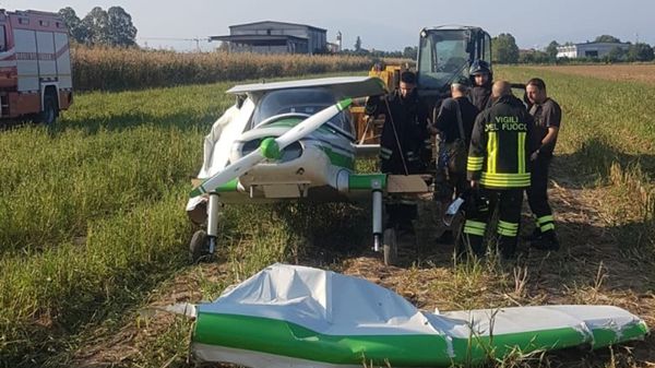 Incidente ad Arcene: un pilota ha dovuto effettuare un atterraggio di emergenza e si è salvato miracolosamente. Il mezzo è finito in un campo nella zona di via Grandi, e si è distrutto.