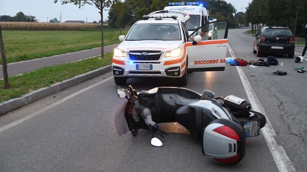 L’incidente questa sera, venerdì 6 settembre, in viale Parini. L’uomo si è scontrato con una Polo ed è rovinato a terra. Ora è in prognosi riservata all’ospedale di Treviglio.