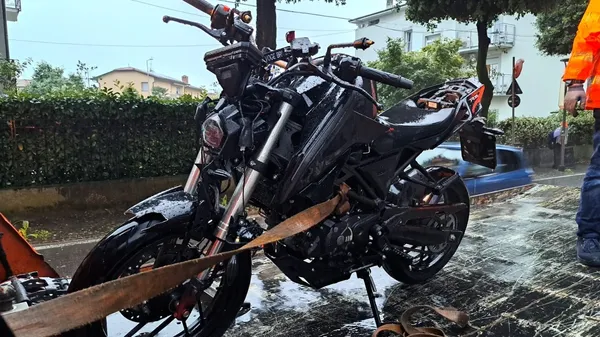 L’incidente è avvenuto domenica verso le 14.30 in pieno centro. L’uomo ha fatto tutto da solo. Soccorso da un medico che era in auto e che ha assistito alla scena.