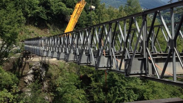 Il nuovo ponte, che sarà posizionato a valle del ponte bailey, sarà lungo 56 metri e costituito da una struttura a scavalco della valle della Corna Grande con due campate.