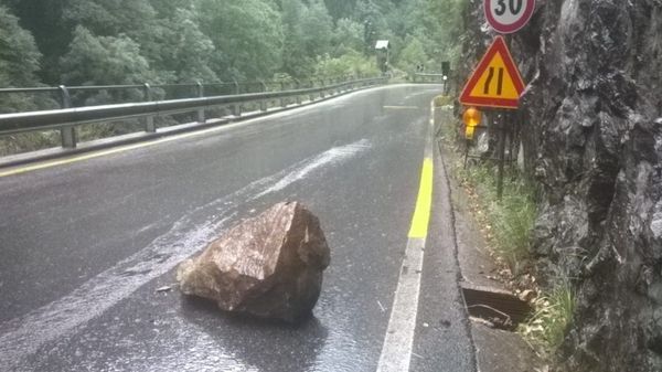 A causa del maltempo un masso di 4 quintali è caduto da una parete a strapiombo sulla strada provinciale, in località Trabuchello.