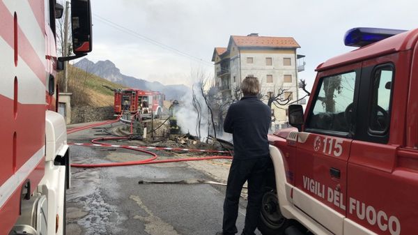 L’incendio di una legnaia in Val Brembilla ha fatto saltare un bombolone del gas. Difficile intervento dei pompieri. Paese mobilitato.