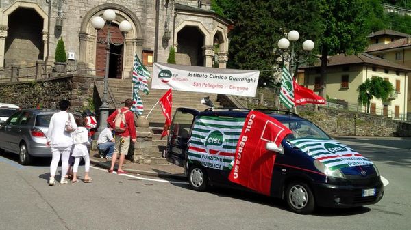 Cisl-Fp e Fp-Cgil hanno manifestato l’8 giugno fuori dall’Istituto Quarenghi. In provincia 2.500 addetti.