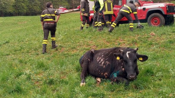 Mucca cade in un dirupo a Endine, salvata con una rete calata dall’elicottero
