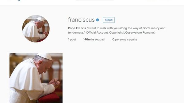 (ANSA) - ROMA, 19 MAR - L'account Instragram di papa Francesco, "@Franciscus", è stato inaugurato alle 12 di oggi, e aveva già avuto diverse migliaia di seguaci quando nei primi minuti dall'apertura, non era ancora stata postata alcuna foto. La …
