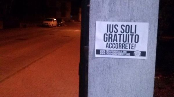 (ANSA) - TORINO, 1 GIU - 'Cittadinanza per tutti, diritti per nessuno', 'Ius soli gratuito. Accorrete', 'Fuori tutto svendita cittadinanza': sono alcuni dei manifesti che Casapound ha affisso nel centro di Rivalta (Torino). L'iniziativa e' stata decisa per protestare contro …