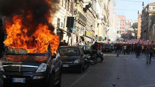 Indignati/ Grande corteo a Roma, anche incidenti in centro Due auto in fiamme, vetrine rotte