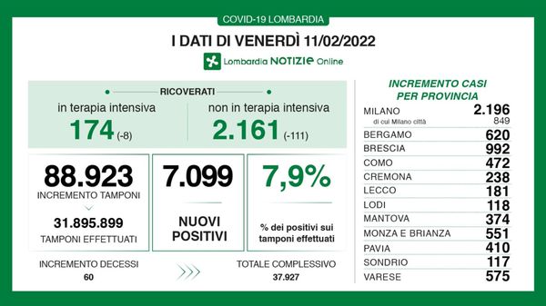 Coronavirus, l’aggiornamento di venerdì 11 febbraio. Effettuati 88.923 tamponi, tasso di positività al 7,9%. Le vittime sono 60.