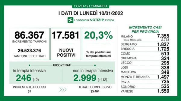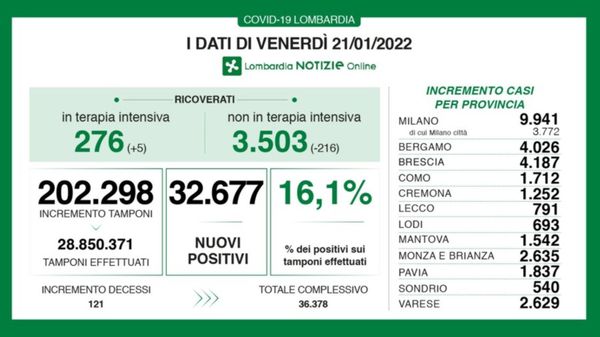 Covid, in Lombardia 32.677 nuovi casi: tasso al 16,1%. A Bergamo +4.026 positivi