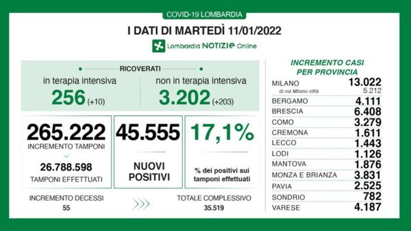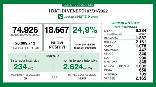 I dati di venerdì 21 gennaio nel report della Regione. Effettuati oltre 202 mila tamponi. In calo i ricoveri nei reparti ordinari (-216), aumentano le terapie intensive (+5). Le vittime sono 121.