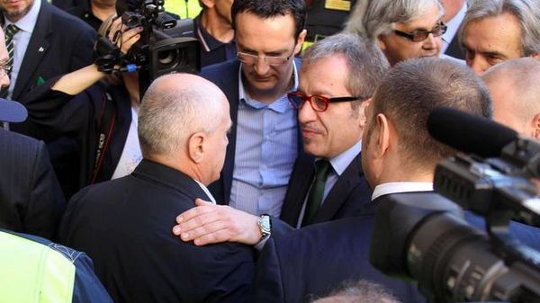 Una stretta di mano e parole di incoraggiamento tra il ministro dell'Interno Roberto Maroni e il sindaco di Brembate, Diego Locatelli, che si sono incontrati nel palazzo della Provincia a Bergamo a una manifestazione per la Protezione Civile.