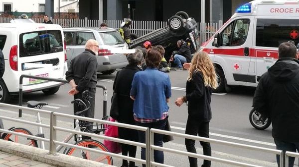 L’incidente in via Corridoni a Bergamo, alle 14.30 di martedì 3 aprile: un’auto si è ribaltata all’altezza del civico 56.
