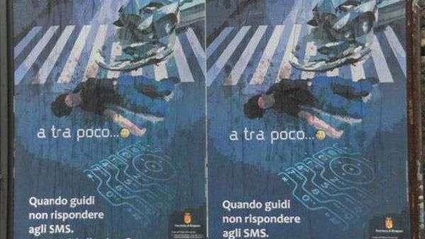 L'immagine non passa inosservata: un cadavere insanguinato, investito sulle strisce pedonali. Ottocento maxi manifesti tappezzano la città e i Comuni più grandi. E' la campagna della Provincia: «Quando guidi non rispondere agli sms».