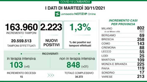 Sono 103 i ricoveri in Terapia intensiva e 858 negli altri reparti: 15 vittime in più nelle ultime 24 ore in Lombardia.