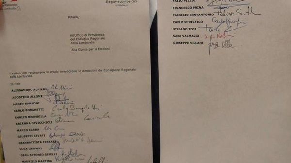 Le opposizioni di centrosinistra in Regione Lombardia invitano il gruppo della Lega a dimettersi formalmente consegnando - insieme ai consiglieri di Pd, Idv, Sel e gruppo Misto - le proprie dimissioni al protocollo del Consiglio regionale, in modo da far decadere la Giunta Formigoni e dunque superando la crisi politica con le elezioni anticipate.