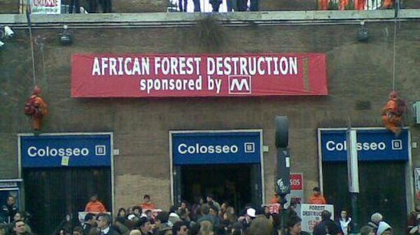 Blitz Greenpeace a Roma e Ravenna: legno illegale per la metro Ambientalisti appendono grande striscione fuori stazione Colosseo