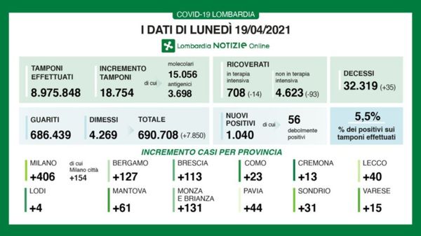 I dati di lunedì 19 aprile nel bollettino regionale. Il rapporto positivi/tamponi è del 5,5%. Le vittime sono 35, i guariti/dimessi 7.850.