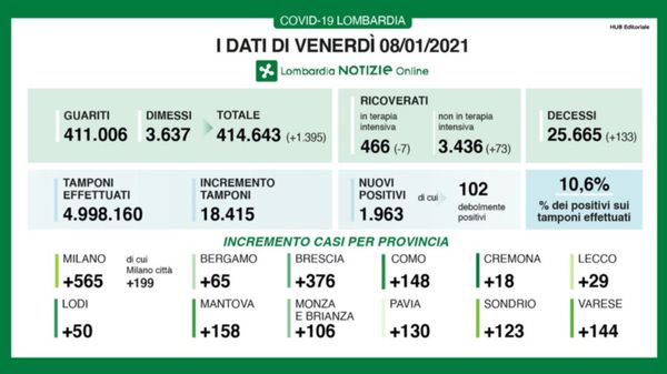 A fronte di 28.462 tamponi effettuati sono 2.952 i nuovi positivi (10,3%). I guariti/dimessi sono 2.486. Sono questi i dati forniti dalla Regione Lombardia per la giornata del 6 gennaio.