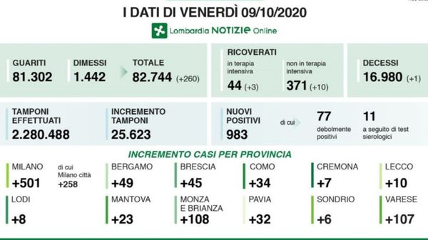 I nuovi contagi giornalieri individuati in Lombardia sono 983, con un balzo che porta la regione a sopravanzare la Campania che ne registra 769.