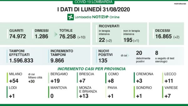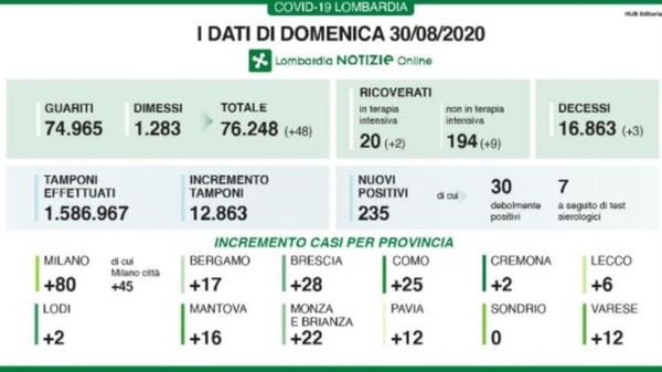Covid, 25 nuovi casi nella Bergamasca Lombardia: 17.082 tamponi, 237 positivi