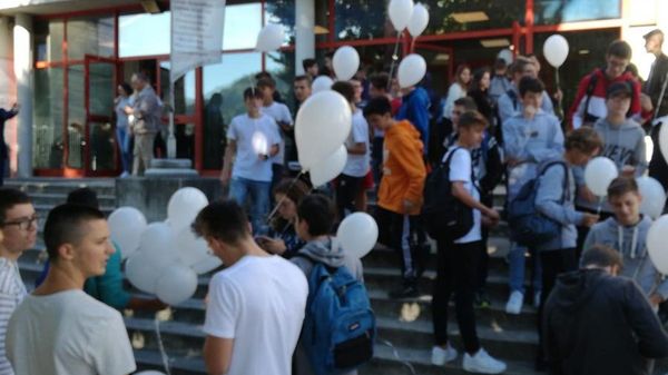 Gli studenti dell’Isiss Valle Seriana alla stazione di Gazzaniga, sul luogo dell’incidente che ha stroncato la vita di Luigi Zanoletti, 14 anni. Poi a scuola il lancio dei palloncini.
