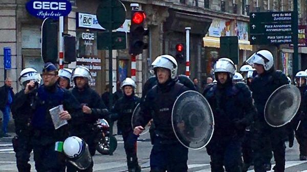 (ANSA) - BRUXELLES, 27 MAR - La polizia in assetto antisommossa è intervenuta con gli idranti per respingere un gruppo di hooligan, con il volto coperto, che hanno manifestato, nonostante i divieti, a Place de la Bourse a Bruxelles, lanciando …
