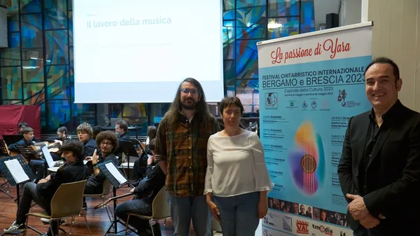LA LEZIONE . Nicola Buttafuoco, chitarrista della band Pinguini Tattici Nucleari, ospite del primo appuntamento del Festival chitarristico internazionale Bergamo Brescia Capitale della Cultura, ha parlato dei segreti del mestiere a un centinaio di studenti del liceo musicale Secco Suardo.