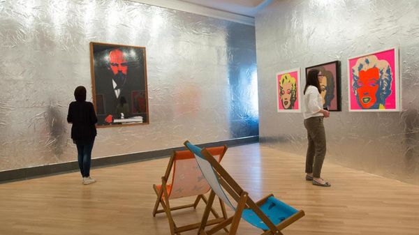 Le pareti sono rivestite di carta argentata, e per riposarsi dalle fatiche della mostra non ci si accomoda su anonimi divanetti ma su sdraio griffate Damien Hirst. È la retrospettiva dedicata ad Andy Warhol, aperta al pubblico da oggi fino al 30 luglio alla Gamec, con un appuntamento speciale domenica 14 maggio.