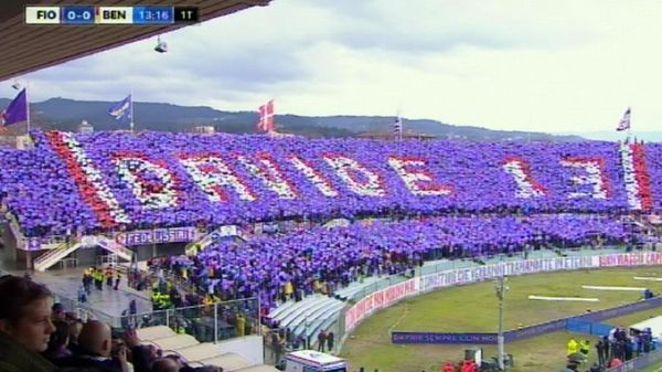 Tutti fermi dentro al campo, è il minuto 13’: così Fiorentina e Benevento ricordano Davide Astori, capitano viola morto nel sonno sette giorni fa nel ritiro della squadra a Udine.