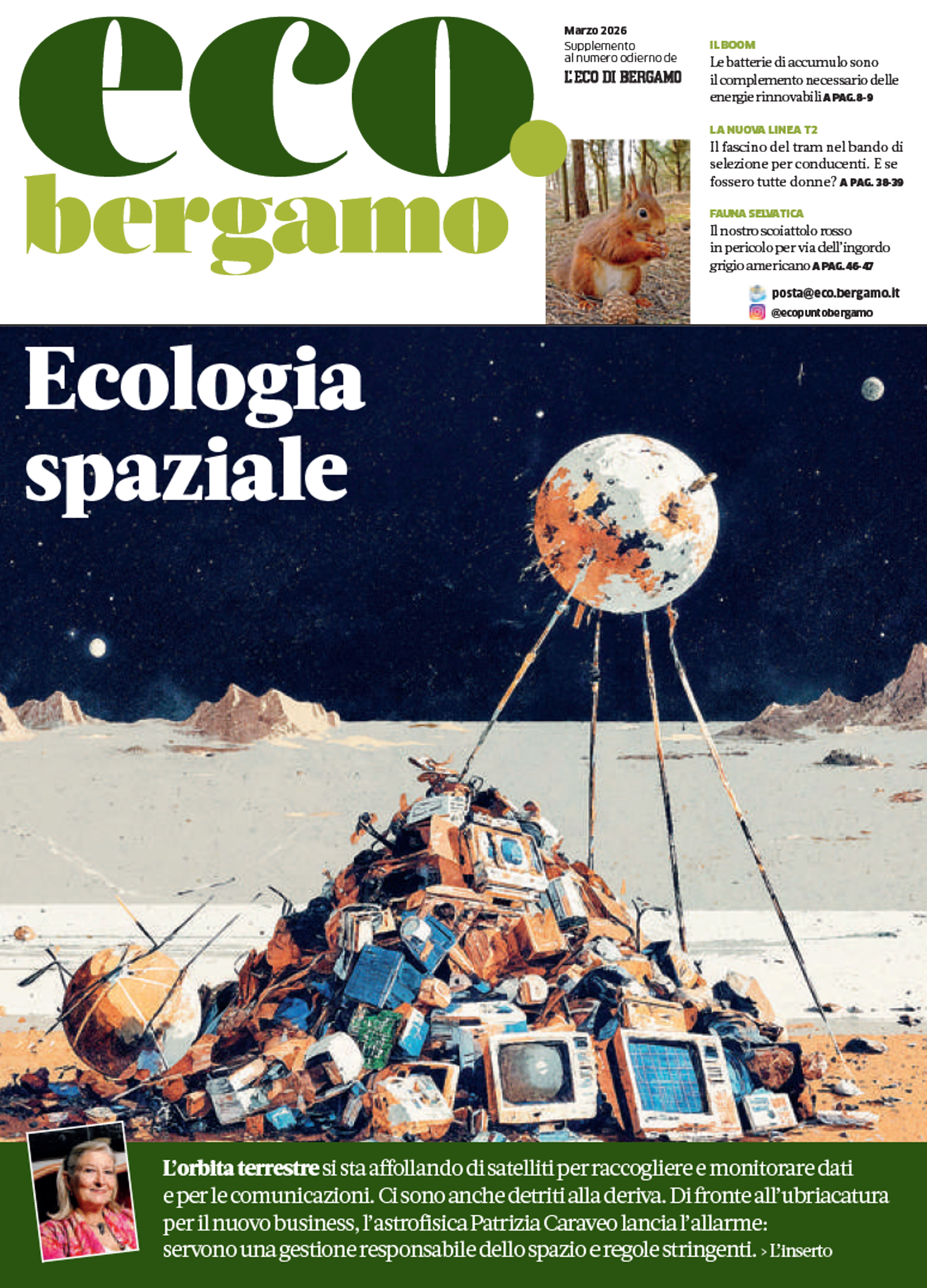 Eco.bergamo è in edicola con un approfondimento dedicato all’ecologia spaziale. Ne parla l’esperta astrofisica Patrizia Caraveo. Trovate poi il racconto delle sfide ambientali: dall’impatto dell’inquinamento alle soluzioni tecnologiche come accumuli energetici, biometano e cattura della CO₂