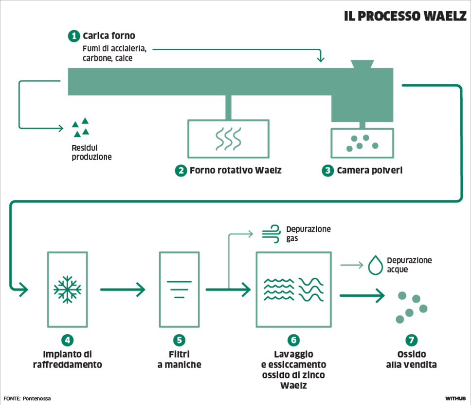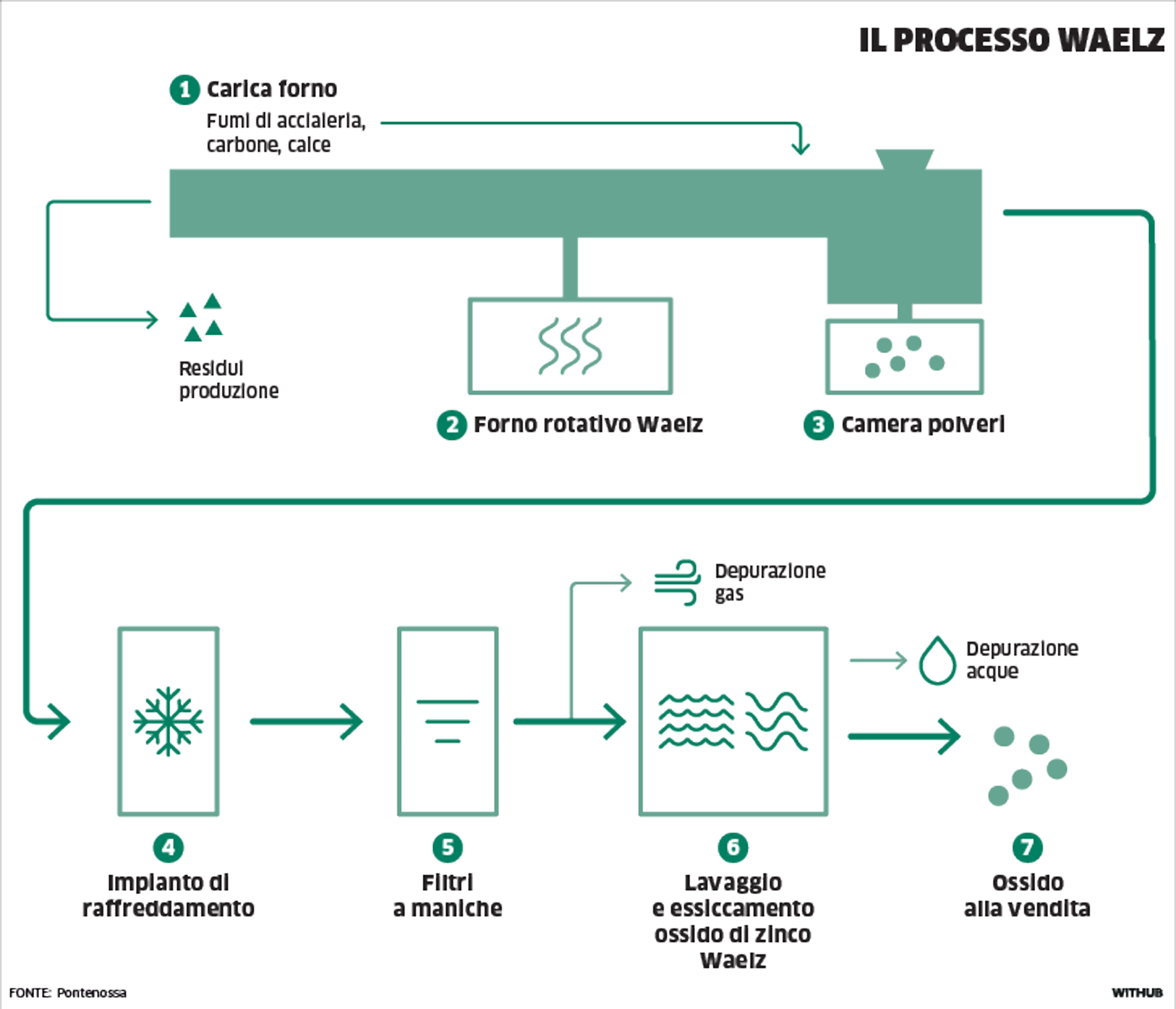 «Il processo produce il “residuo Waelz”, un materiale solido composto per lo più da ossido di ferro e calce. In diversi Paesi, anche europei, lo si utilizza come alternativa agli aggregati tradizionali, quali sabbia e ghiaia, per l’edilizia e per le strade. In percentuali minime, però, il residuo potrebbe contenere elementi potenzialmente pericolosi per l’ambiente, come cadmio e piombo. Da tempo stiamo conducendo degli esperimenti per confermare che il residuo Waelz della Pontenossa, dopo un certo periodo di maturazione in condizioni naturali di pioggia e sole in un sito dedicato, perde totalmente la sua pericolosità ecologica».