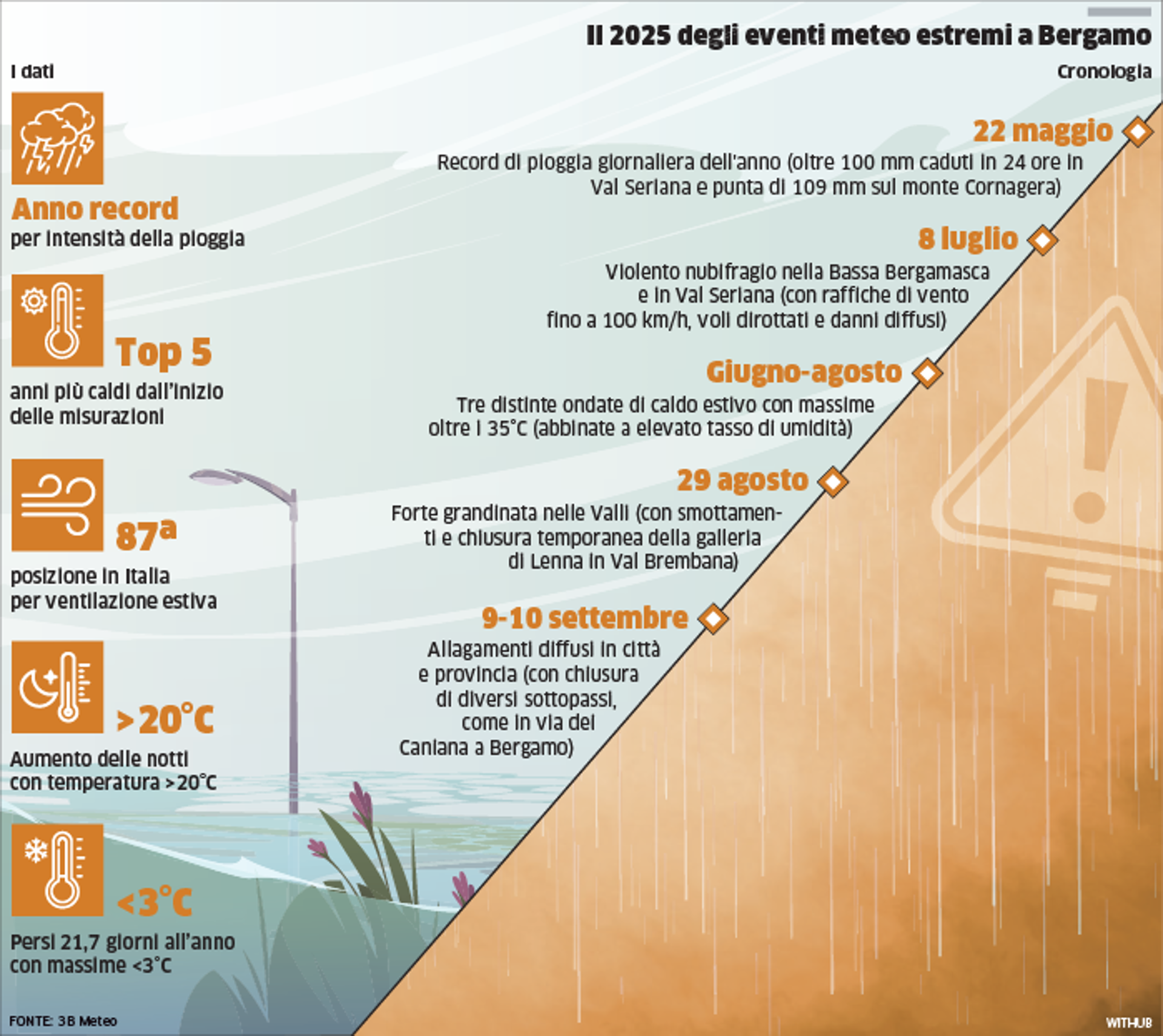 Piogge record, temporali violenti, ondate di calore afoso. Il 2025 è stato per la provincia di Bergamo un anno meteorologicamente complesso, in linea con la situazione del resto della Penisola, in cui è stato il secondo anno con più eventi meteo, e della Lombardia, prima regione in Italia per impatti da eventi meteo estremi. «Un anno che ancora una volta mostra come anche la nostra provincia non è esclusa dall’aumento della frequenza e dall’intensità degli eventi estremi, confermando altresì il trend di aumento delle temperature degli ultimi decenni», è il riassunto di Manuel Mazzoleni, meteorologo di 3BMeteo, che ricorda, tra gli eventi meteo estremi dell’anno, «il record di pioggia giornaliera dell’anno del 22 maggio, con oltre 100 mm caduti in 24 ore in Val Seriana; la fortissima ondata di maltempo che ha colpito la città e la provincia tra il 9 e il 10 settembre; il violento nubifragio di inizio luglio nella Bassa Bergamasca e in Val Seriana; la forte grandinata che ha colpito le valli il 29 agosto e le tre distinte ondate di caldo estivo con massime oltre i 35°C».