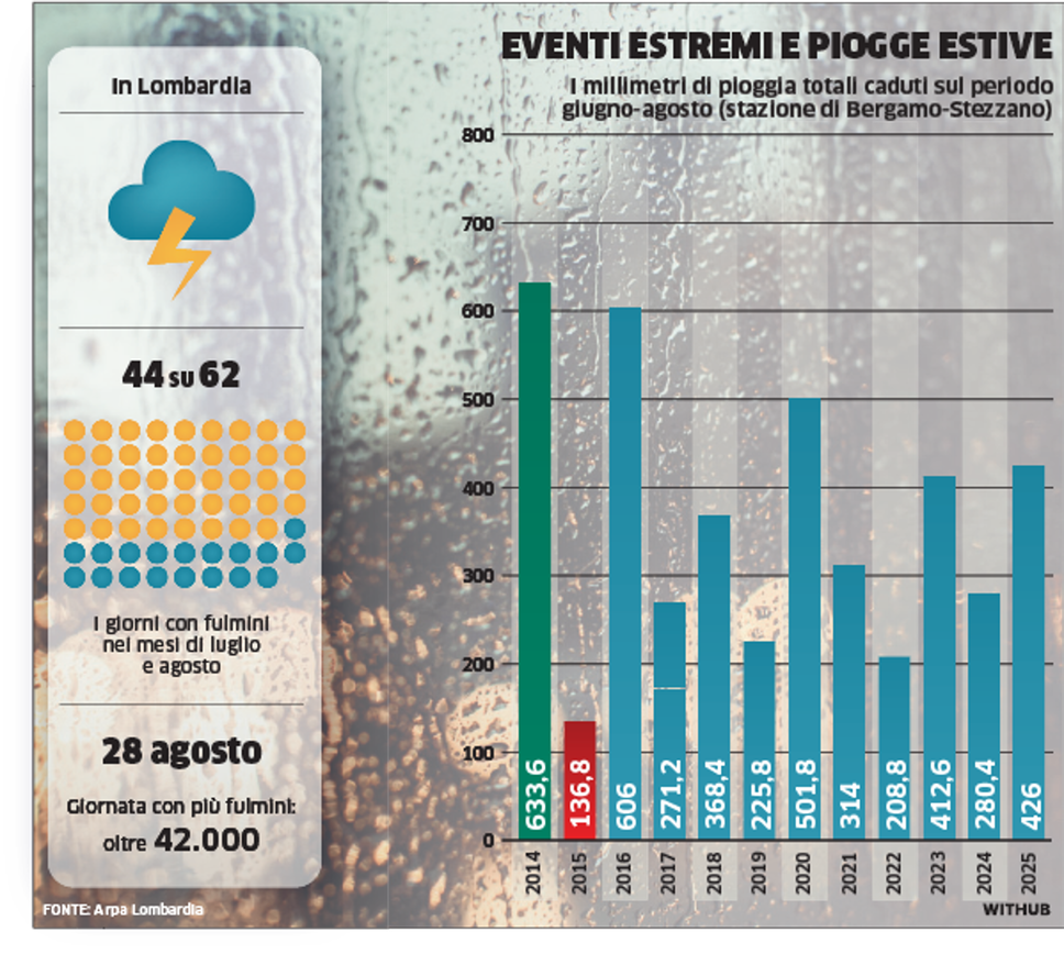 Nella bergamasca la sesta stagione più piovosa del periodo 1991-2020, con un’anomalia in termini di quantità del +30%. Il 28 agosto si sono abbattuti 42mila fulmini sulla Lombardia. Si sperimentano radar per prevedere gli eventi estremi.