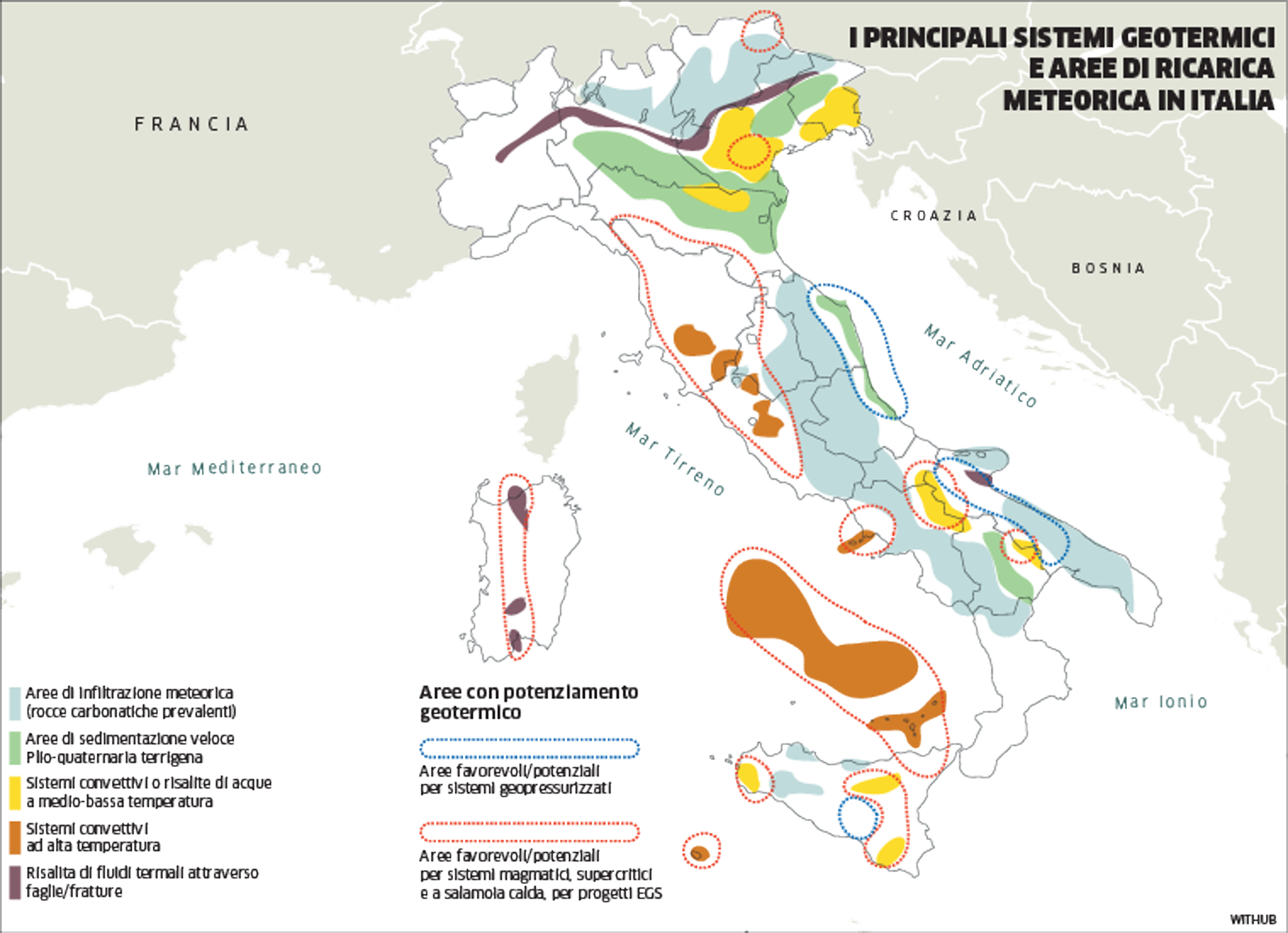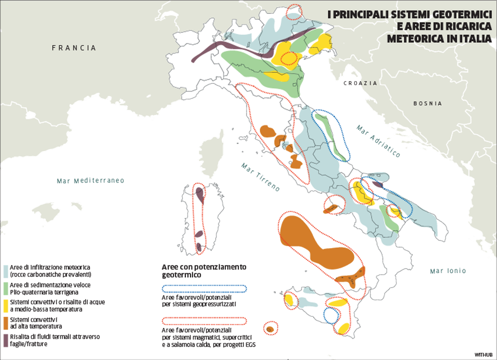 «Il calore geotermico è disponibile ovunque: la temperatura aumenta di circa tre gradi ogni 100 metri, in media. Fortunatamente, nel nostro Paese ci sono delle zone anomale dove il calore è molto maggiore: questo è il caso della parte di Toscana attorno al monte Amiata e a Larderello, ma anche dei Campi Flegrei, dei Colli Euganei e di alcune zone della Sicilia. Lì il gradiente termico, cioè l’aumento di temperatura connesso all’incremento della profondità, è maggiore: gli impianti Enel in Toscana si fermano tra i tremila e i cinquemila metri di profondità. Alcune di queste zone, però, non sono ancora state sfruttate adeguatamente».