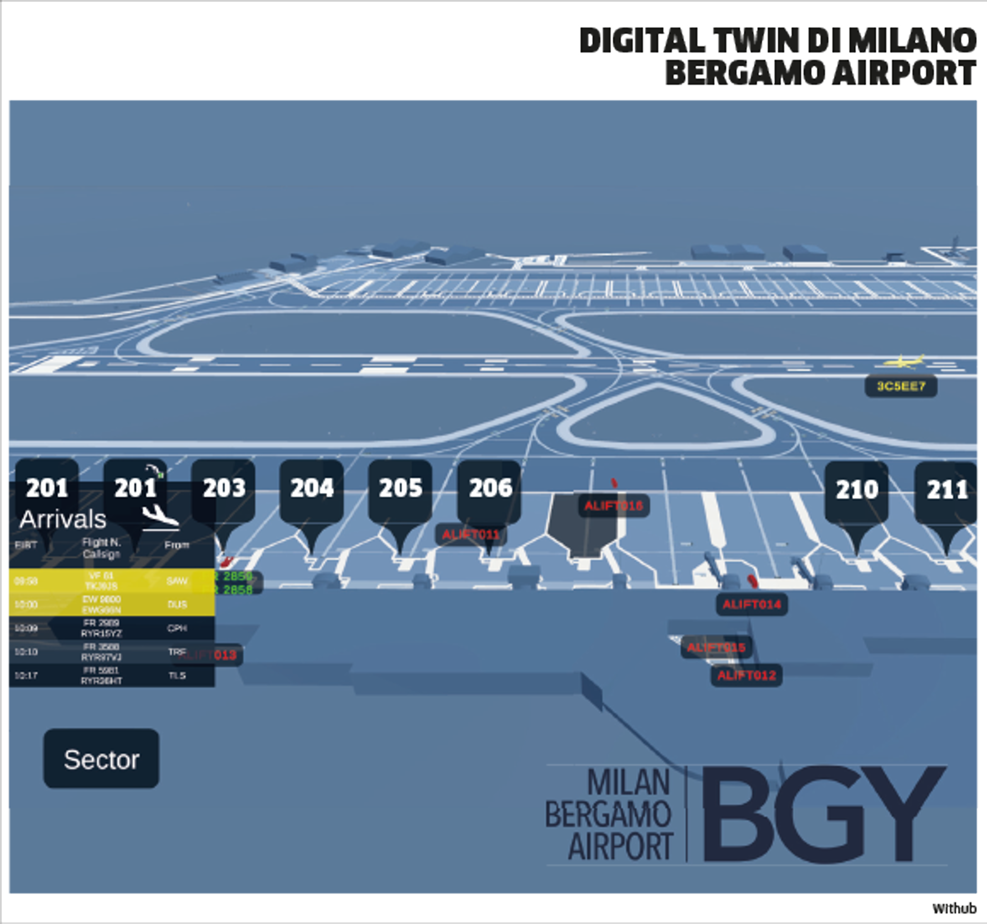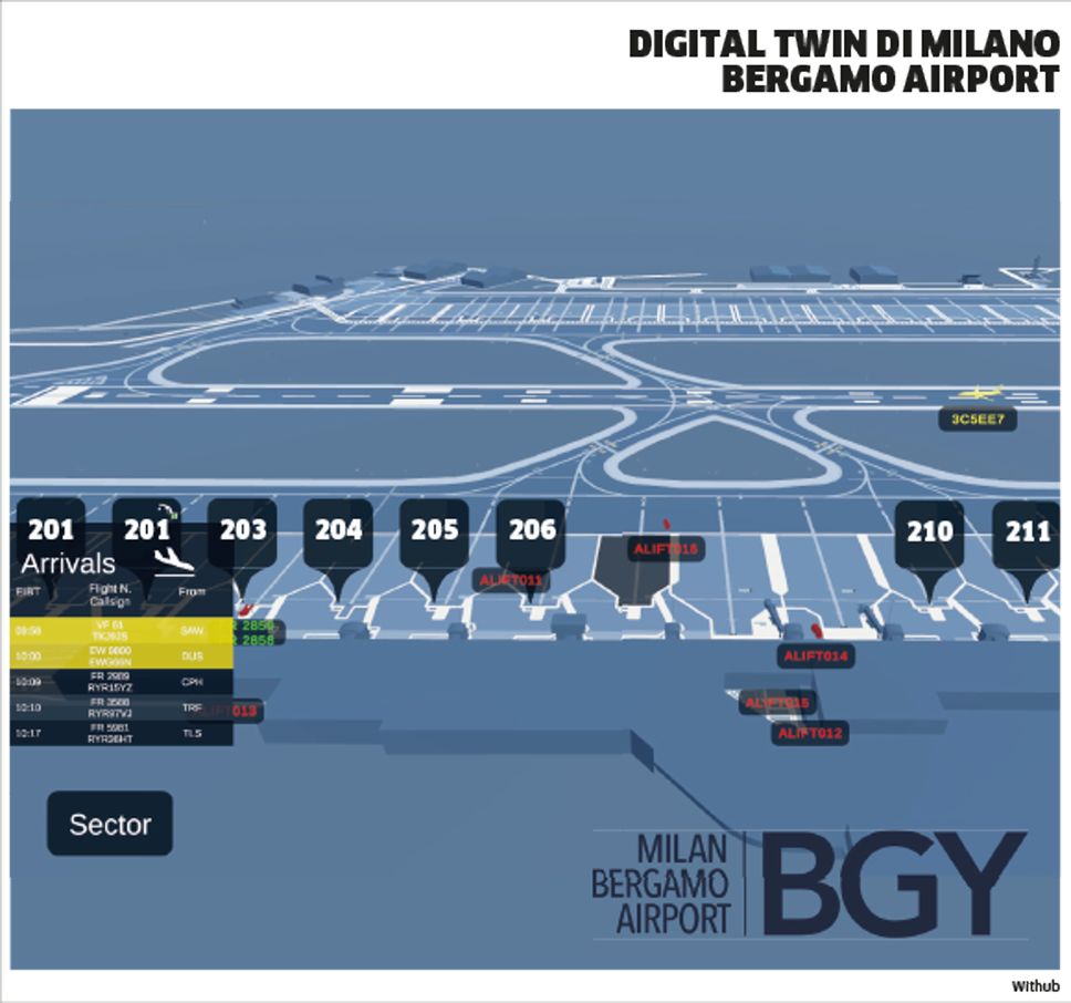 Lanciato ad aprile 2025, il progetto «Airport virtual infrastructure operation» (Avio) ha dato origine a una visualizzazione integrata e propriamente modellata nel gemello digitale di dati provenienti da diverse sorgenti migliorando la situational awarness di piazzale della porzione «airside» del Milan Bergamo Airport di Orio al Serio. Si tratta di un «Digital twin» basato sul monitoraggio costante dei dati prodotti dalle telecamere e dai sensori sparsi per lo scalo.