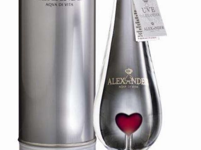 La scelta di una selezione di grappa di Pinot, morbida, profumata e dalla moderata gradazione alcolica (38°), è un invito implicito a un brindisi d'amore. La bottiglia che ha una capacità di 20 cl è racchiusa in un elegante tubo metallico di colore argento. Il prezzo al pubblico di Alexander Cuore è di circa 39 €.