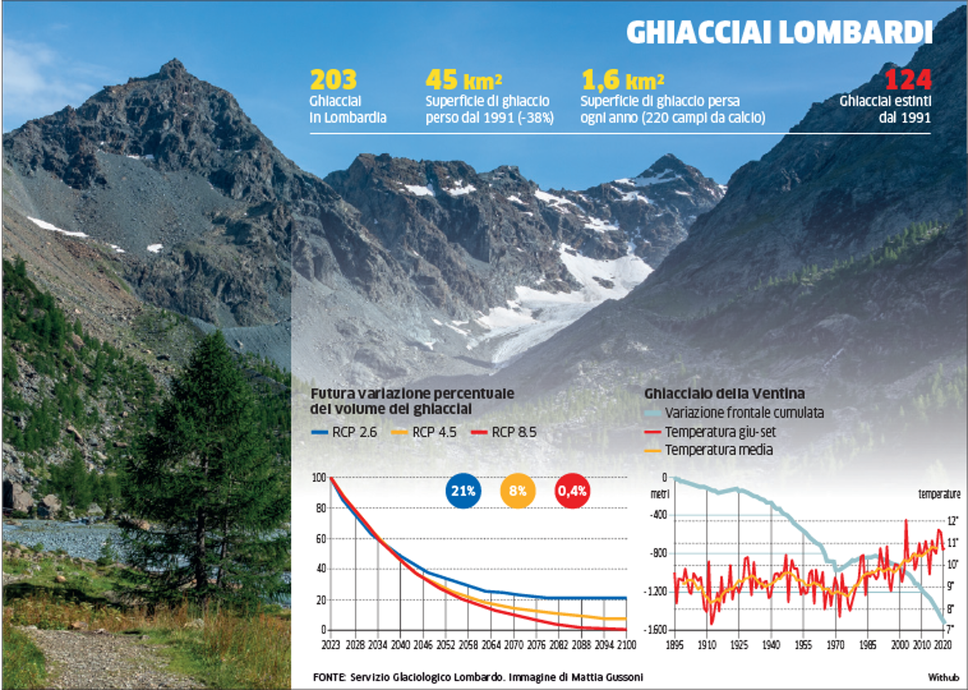 «Negli ultimi vent’anni il regresso glaciale ha raggiunto tassi mai sperimentati prima»: è tassativo, nella sua analisi, Mattia Gussoni, glaciologo del Servizio glaciologico lombardo. Come caso limite porta quello del ghiacciaio della Ventina, in alta Valmalenco, per il quale «nell’ultimo decennio il regresso è stato di oltre 500 metri: in pratica abbiamo perso per sempre l’equivalente di 5 campi da calcio in pochissimo tempo». La situazione del Ventina è simbolica e va paragonata al tasso medio di ritiro annuo dell’ultimo secolo, che è di circa 15 metri, mentre «nell’ultimo periodo si è passati a circa 40-50 metri ogni anno, un valore doppio, quasi triplo, e del tutto nuovo e anomalo per quanto concerne la storia del ghiacciaio». Complessivamente, dal segnale del 1895, l’intera serie di misure ha testimoniato un arretramento complessivo di 1,7 km. Come riporta il Servizio glaciologico lombardo, infatti, «il continuo arretramento della fronte del ghiacciaio della Ventina ha drasticamente modificato la morfologia della fronte, oggi formata in larga parte da placche di ghiaccio sepolte dal detrito e disgiunte dalla massa di ghiaccio principale». Il bilancio di quest’estate è già negativo e il ghiacciaio potrà conservare circa la metà del volume residuo di ghiaccio solo se ci sarà una sostanziale riduzione delle emissioni di gas climalteranti e il conseguente contenimento del riscaldamento planetario entro i +2°C rispetto all’epoca preindustriale. Nello scenario peggiore, il ghiacciaio si ridurrebbe del 90%.