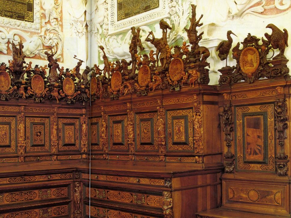 I grandi armadi con le superbe cimase, ricche di figure d’ogni grandeza e forma, i martiri e i loro carnefici scolpiti in maniera sorprendente, la testa dei cherubini, le lesene, le cariatidi contorte e affaticate rivelano non solo un’attenzione certosina nella esecuzione di livello superbo ed eccezionale, ma anche una personalità artistica sicuramente geniale.