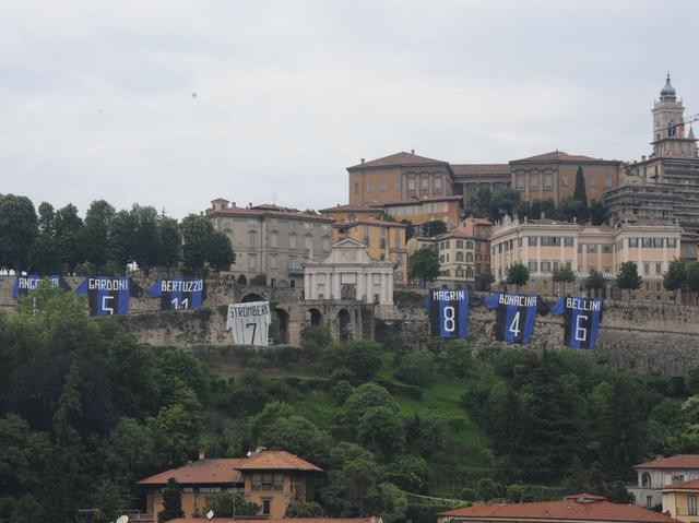 Sono così grandi che sono ben visibili anche da Porta Nuova, come si può vedere dalle fotografie. Ci riferiamo alle maglie di Angeleri, Gardoni, Bertuzzo, Stromberg (l'unica bianca nella marea nerazzurra), Magrin, Bonacina e Bellini che sono state piazzate ai lati di Porta San Giacomo.
