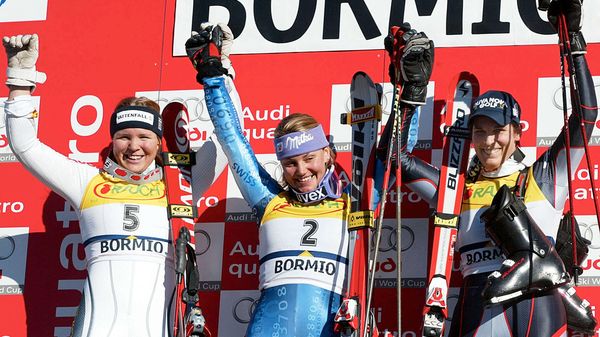Il podio del gigante femminile di Bormio: da sinistra Paerson, Nef e Dorfmeister