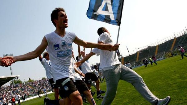 L'urlo liberatorio tanto atteso è esploso dopo i due minuti di recupero concessi dall'arbitro Cervellera di Taranto: l'Atalanta è in Serie A. Grandissima la gioia in campo e sugli spalti. Una festa che si è spostata in centro dove il traffico è andato in tilt fino verso le 19.