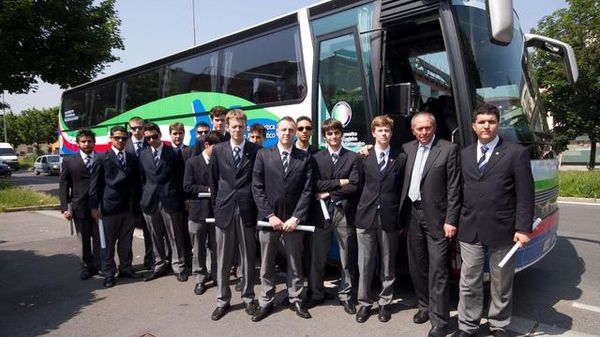 Giuseppe Di Giminiani, preside dell'Istituto Aeronautico Locatelli, si è messo alla guida di un bel pullman con i colori della scuola per condurre personalmente mezzo, e alunni, in visita allo storico stabilimento della Aermacchi a Varese.