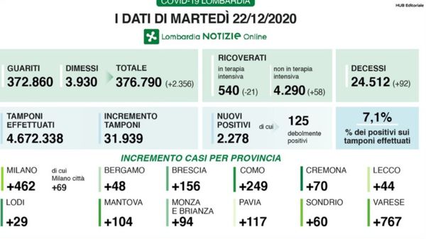 I dati del 22 dicembre nel bollettino della Regione. Il rapporto positivi/tamponi è sceso al 7,1%. I decessi sono 92.