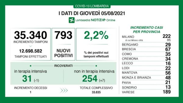 L’aggiornamento nel report di giovedì 5 agosto. Tasso di positività al 2,2,%.