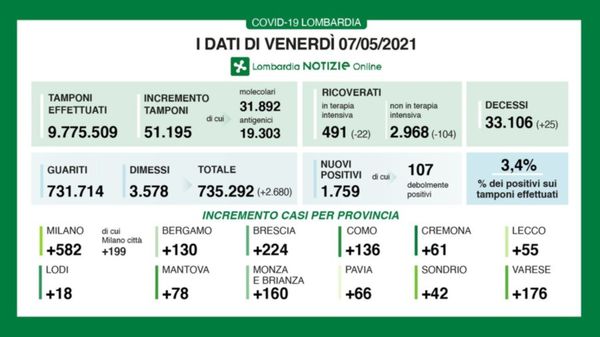 I dati regionali nel report di venerdì 7 maggio. Il rapporto positivi/tamponi è del 3,4%, continua il calo dei ricoveri. Il presidente della Regione: «Servono più vaccini. Nel frattempo continuiamo a comportarci responsabilmente e rispettiamo le regole».