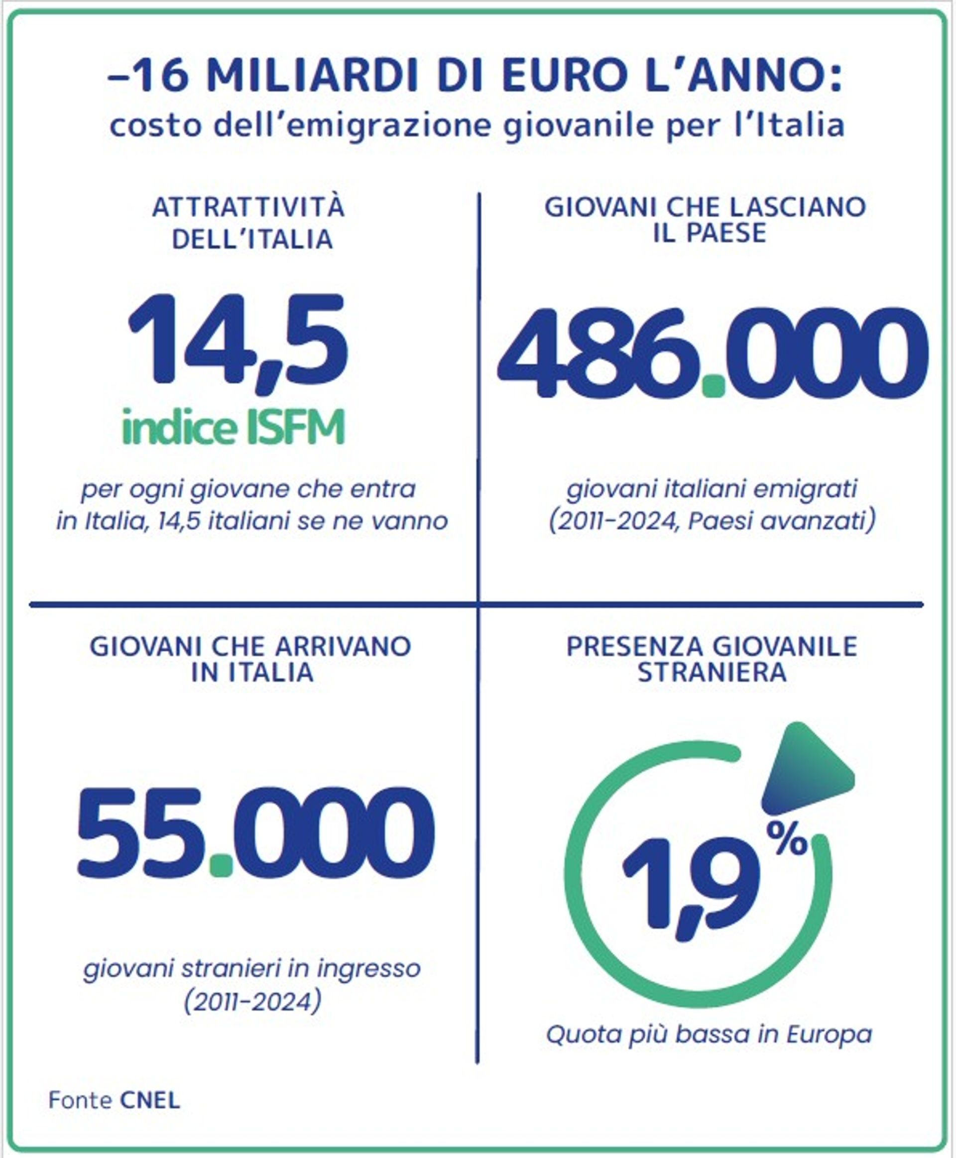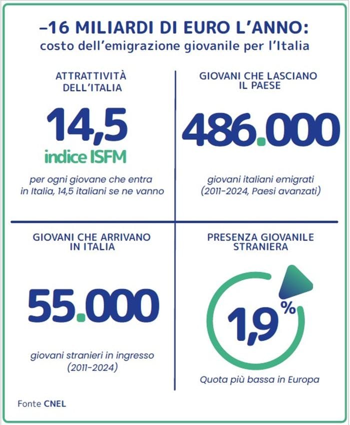 Tutto questo ha un costo economico molto concreto. Il Cnel stima che l’uscita dei giovani comporti per l’Italia una perdita di circa 16 miliardi di euro l’anno, considerando gli investimenti pubblici e privati sostenuti per la loro crescita e formazione. Nel periodo 2011–2024 la perdita cumulata arriva a quasi 160 miliardi di euro, con un impatto stimato vicino a 0,8 punti di Pil all’anno. È capitale umano formato in Italia che genera valore aggiunto altrove.