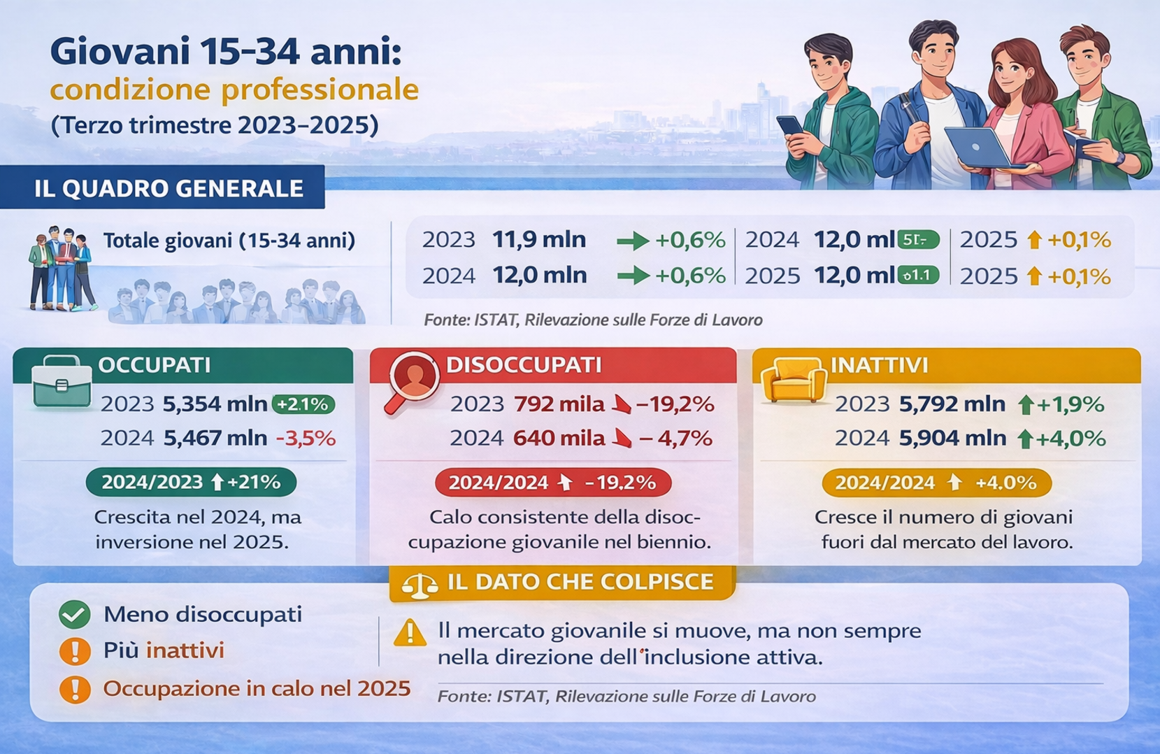 Dopo una fase di forte espansione, l’occupazione giovanile ha frenato sino a invertire la rotta. Nel terzo trimestre del 2025, gli occupati nella fascia 15-34 anni sono diminuiti del 3,5% (190mila in meno), ma al tempo stesso anche i disoccupati sono calati del 4,7% (-30mila). Ad allargarsi è così la platea degli inattivi, aumentata del 4% (+235mila). È una dinamica che, secondo il report, rivela diverse «fratture».