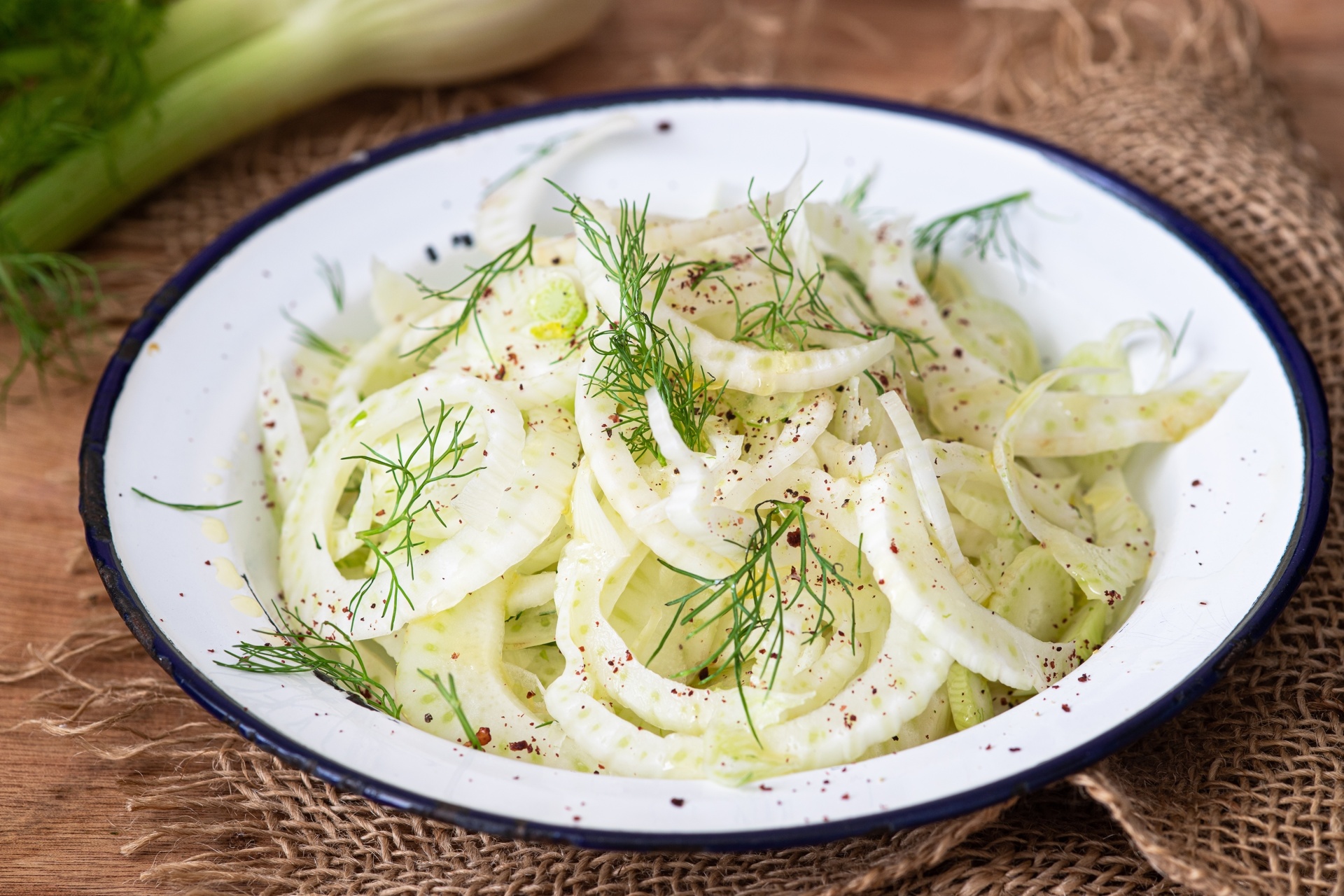 L’insalata di finocchi è una delle mie preferite in assoluto. Il finocchio è un ortaggio invernale che è disponib ile da ottobre e fino a marzo-aprile. Se nei periodi più freddi preferisco mangiarlo al vapore o gratinato al forno, già dalle prime giornate di sole per me esiste un solo modo di “cucinare” i finocchi: in insalata. Dopo aver lavato bene gli ortaggi, togliete il gambo e la parte più dura alla radice. Con una mandolina affettate delle sottilissime rondelle. Condite con sale, pepe e una generosa dose di olio extravergine d’oliva.