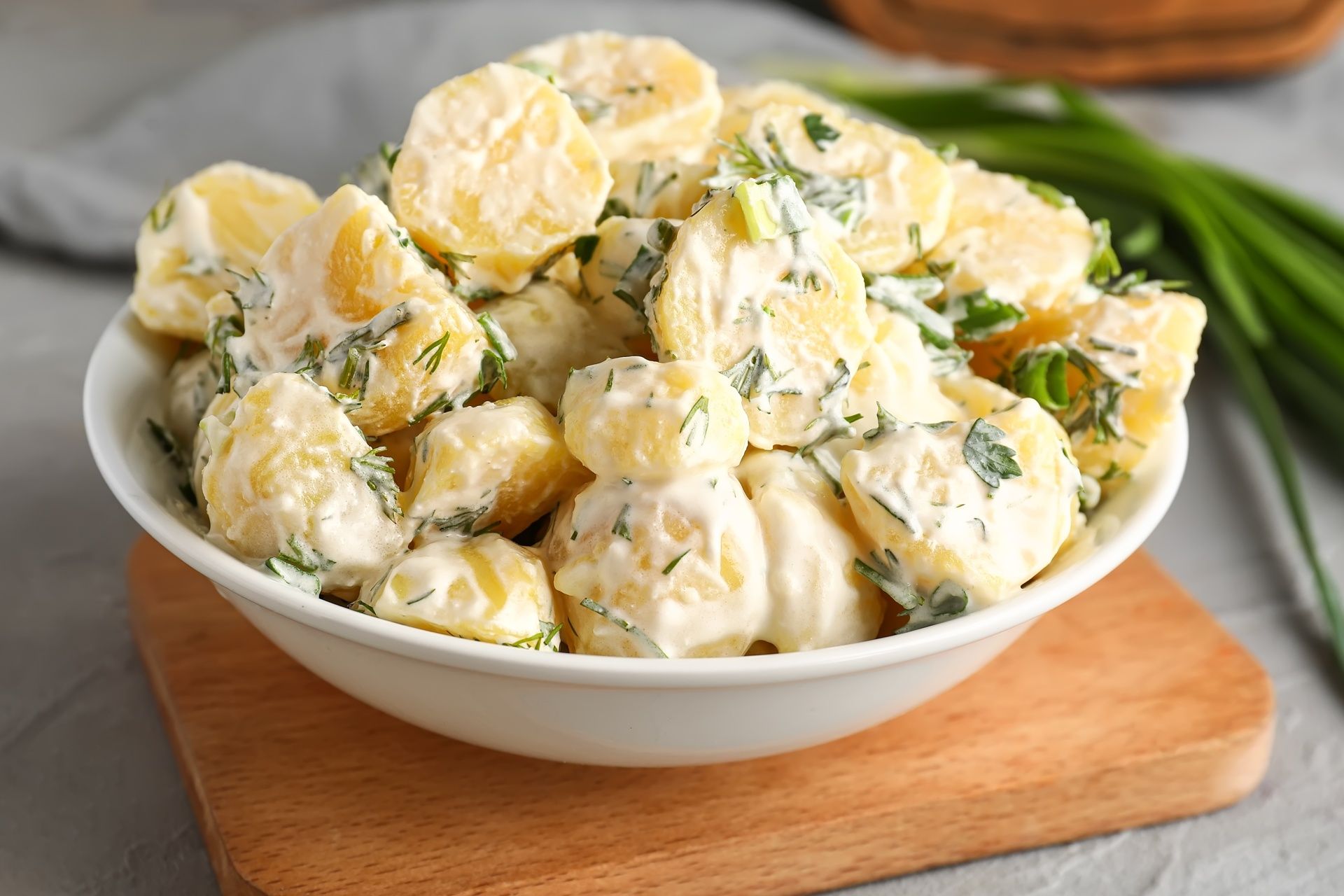Questa insalata è di ispirazione nordica: le insalate di patate con la salsa allo yogurt o con la maionese sono tipiche di Germania, Austria e Scandinavia. Questa è la loro versione mediterranea ma anche più light. Lessate e lasciate intiepidire le patate novelle, tagliatele a pezzettoni e mettetele in una ciotola. Aggiungete del tonno sgocciolato (meglio quello al naturale, condito con olio extravergine d’oliva) e uova sode a cubetti. Mescolate tutto insieme, condite con sale e pepe. Preparate a parte una salsa di yogurt con due cucchiai di yogurt greco, pepe, sale, un filo d’olio e della menta fresca tritata fine.