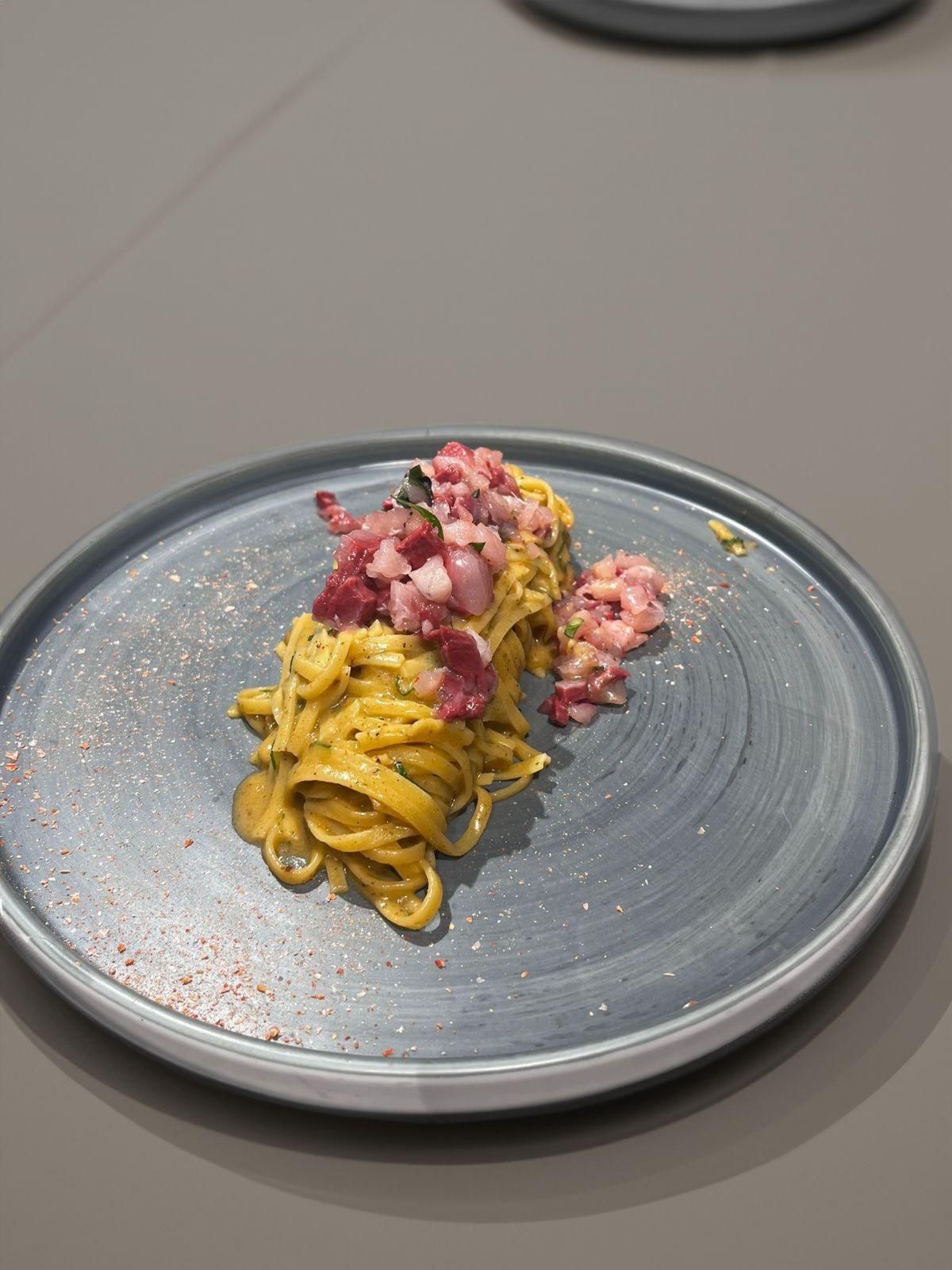 Sia sulla carne che sul pesce, la ricerca è costante. Accanto al menù stagionale, ovvero la carta principale – che garantisce continuità e disponibilità – trova spazio una lista di fuori menù pensata per valorizzare prodotti freschissimi e in quantità limitata. È il caso, ad esempio, del tartufo che viene portato freschissimo dai tartufai di fiducia. In questo periodo è attiva anche una bella collaborazione con un’azienda agricola di Stezzano, a pochi passi da Zanica: si tratta di un allevamento locale di razza piemontese, con alimentazione biologica e autoprodotta, che fornisce tagli di carne pregiati in piccole quantità. Una produzione per questo ancora più selezionata, attenta al benessere animale e alla qualità della filiera, che permette di portare in tavola carni di assoluta eccellenza (e per questo disponibili in piccole quantità).